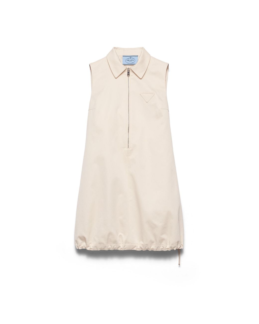 Unlined---Shirt collar---Front zipper closure---Sleeveless---Inseam pockets---Fabric triangle logo---Flared hem---Drawstring hem