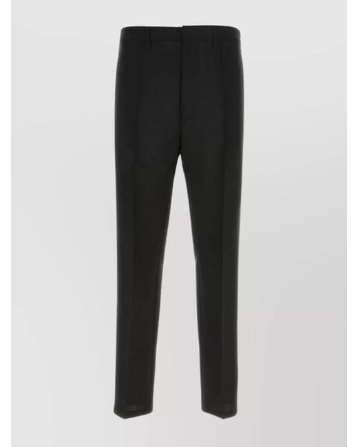 Central ironed pleats | Cigarette pant silhouette | Cuffed hem | Mohair and wool composition | Belt loops at the waist | Contrasting bands on the sides | Side stripe detail | Seam pockets and a zip pocket at the back | Iconic metal logoed triangle at the back | Concealed zip and hook closure Colour: black