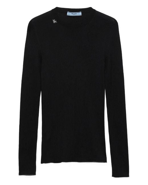 Black ribbed knit enameled metal triangle logo crew neck long sleeves semi-raglan shoulder Size: 36. Gender: Female. Material:Virgin Wool.