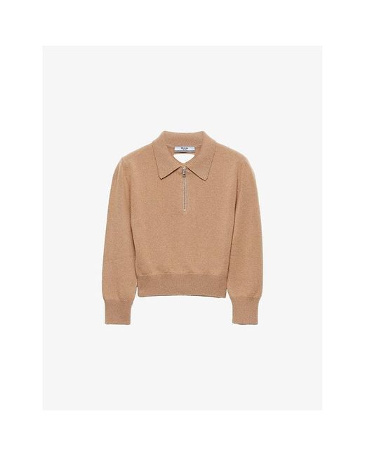 Prada cashmere jumper100% cashmerePulls onPolo collar, short sleeves, ribbed trims, logo at back, straight hemTrue to sizeMidweight, slight stretchPlease note, we are unable to accept in-store returns on Prada orders Colour: natural