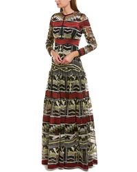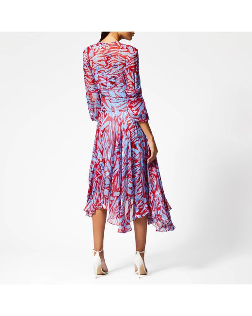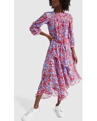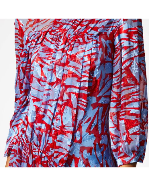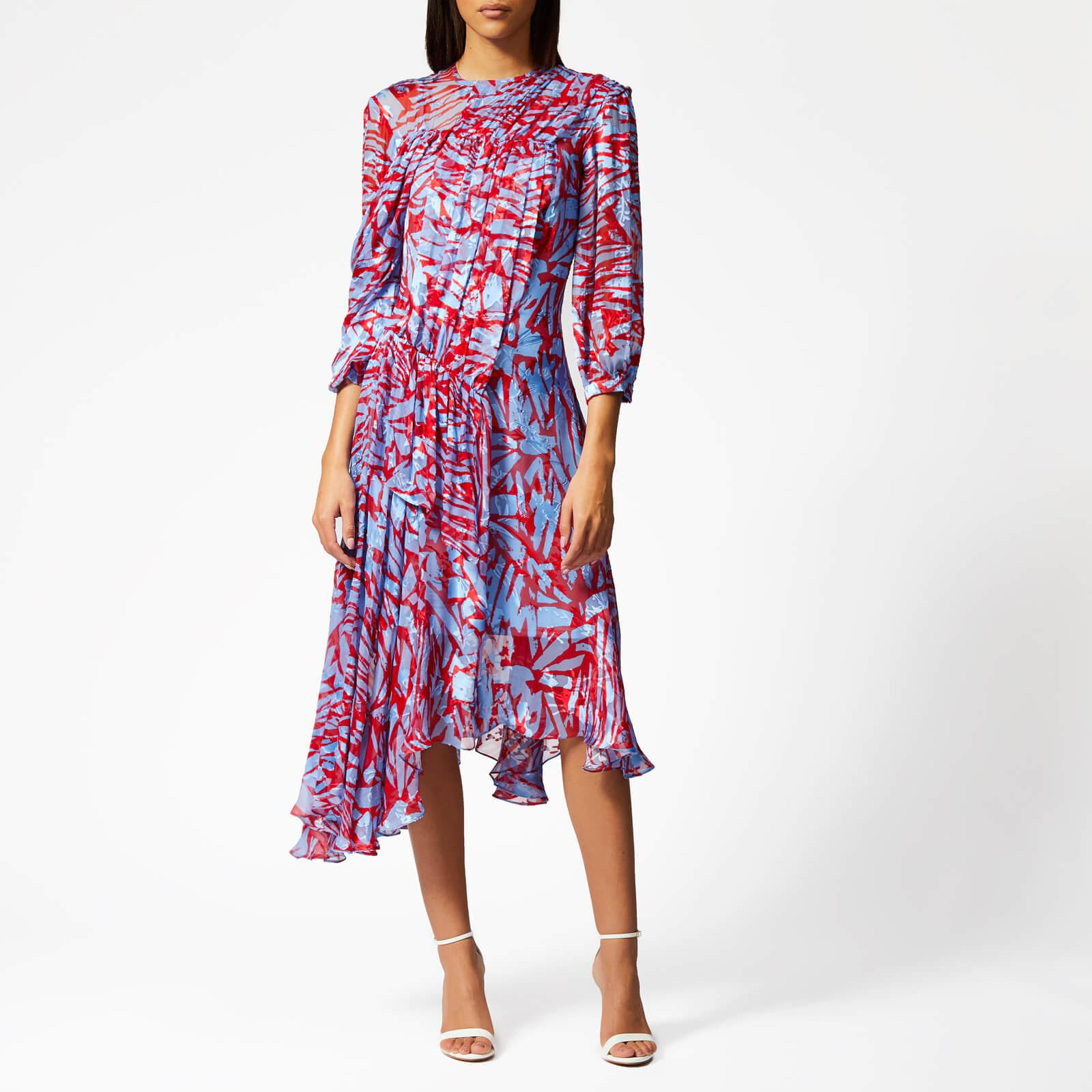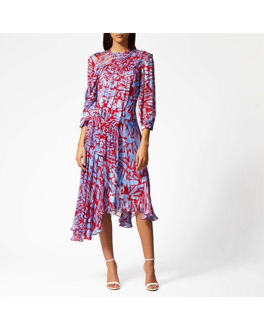 Printed in Preen By Thornton Bregazzi's red and blue geometric print, the women's 'Helen' dress, crafted from lustrous silk satin devore, boasts a flattering fit-and-flare silhouette with a cinched, gathered waist and signature asymmetric skirt. Accentuated with pleats that lend texture, the floaty midi dress is designed with a high neck and 3⁄4-length sleeves with buttoned cuffs. Fastened with an on-seam side zip and a button-and-loop closure at the nape, the fluid dress is complete with a cami dress slip. 56% Silk, 44% Viscose. Colour: red