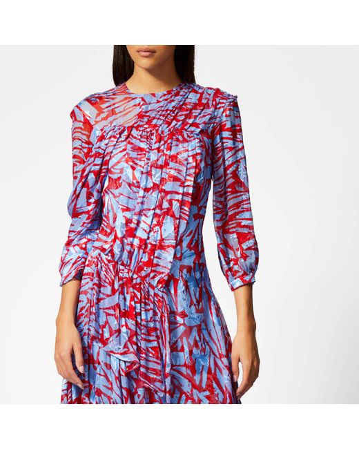 This red Helen dress features an abstract blue camouflage-inspired pattern, embodying Preen by Thornton Bregazzi's signature feminine yet punk-inspired aesthetic. It's cut from a smooth silk blend with a round neck and slightly ballooned sleeves, and features ruffles and gathers at the bodice, then falls to an elegant asymmetric skirt. Team it with suede boots to make a subtle statement with your weekday look.