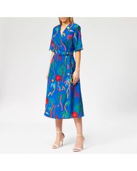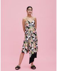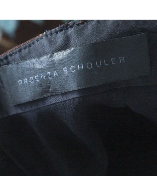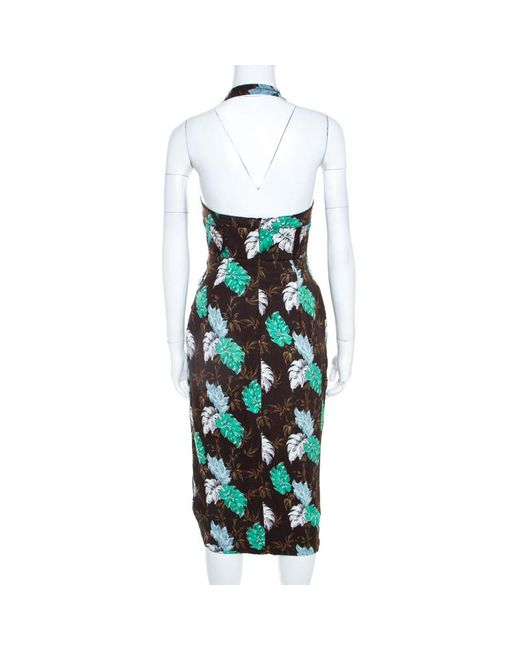 This halter neck midi dress is by Proenza Schouler. Covered in a brown jungle leaf print, the draped dress gives a boho feel. Perfect for a holiday, it will look good with sun hat and sandals or flats. Includes: The Luxury Wardrobe Packaging. Fabric: Shell : 95% Viscose, 5% Elastane ( Lining : 100% Silk ). Occasion: Evening. Closure: Zip. Season: Spring 2012. Condition: Gently Used. This item is in good condition with minor discoloration and thread pulls on the main fabric. There are minor signs of stress on the elastic trim, neck strap and smocked detailing at the bodice. There are minor alteration stitches at the back bodice, near the zipper closure area.. Colour: brown