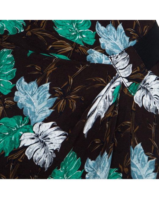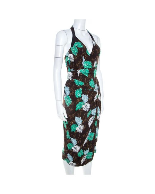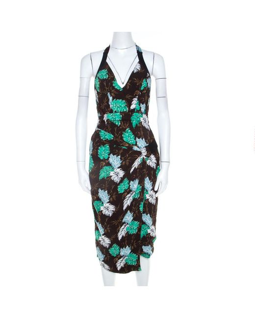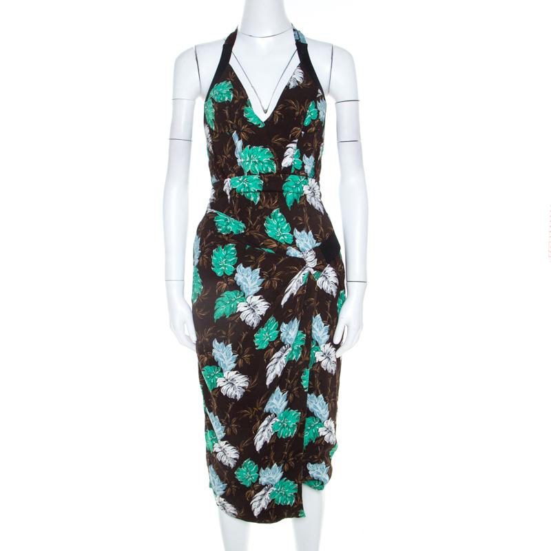 Women's Brown Jungle Leaf Print Draped Halter Midi Dress S