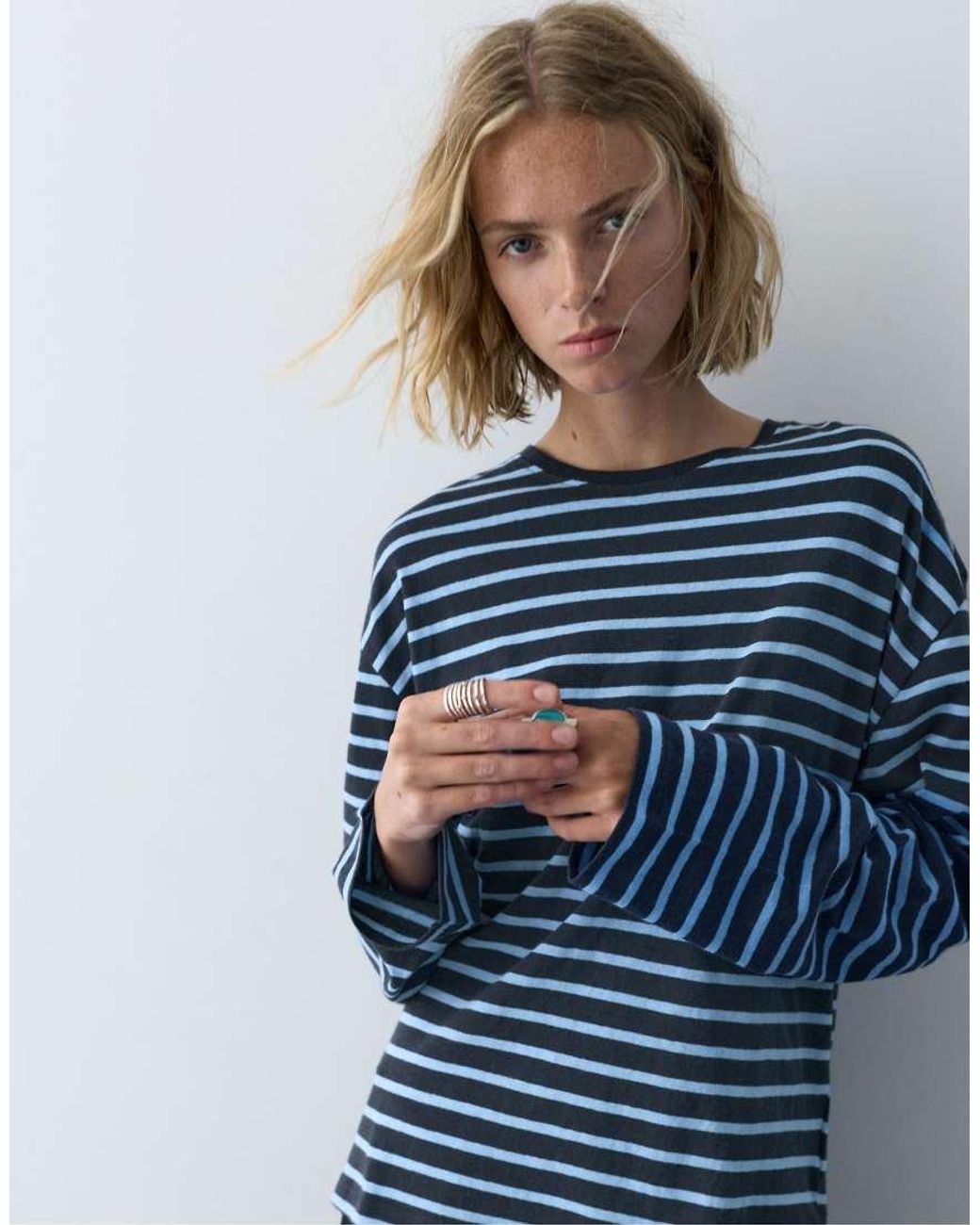 Tops by Pull&Bear Crew neck Long sleeves Striped pattern Relaxed fit. Cotton. Colour: blue