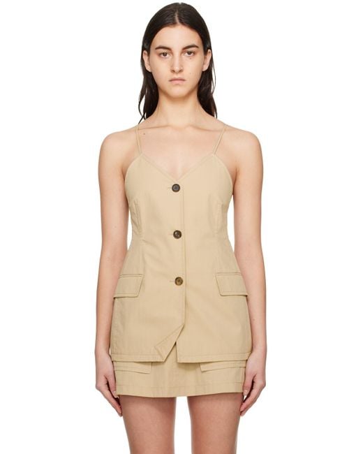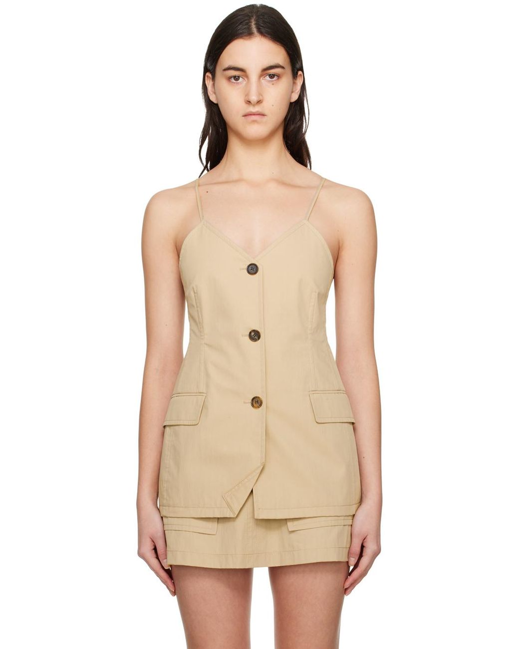 Cotton and nylon-blend twill camisole. · V-neck · Button closure · Darts at front · Flap pockets · Vent at back hem · Contrast stitching in white Supplier color: Beige Colour: natural