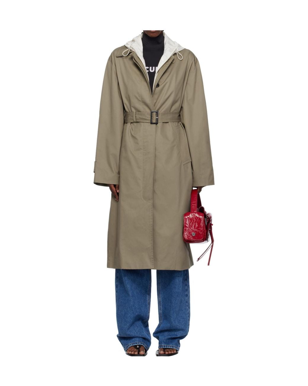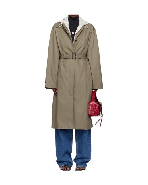 Detachable ripstop hood with elastic drawstring, lapel, button placket, belt loop and detachable buckle belt, patch pockets, button loops at the cuffs, centre vent at the back, full satin lining. Colour: natural