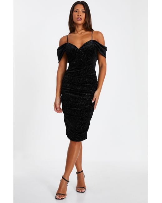 Women's Black Velvet Glitter Cold Shoulder Midi Dress