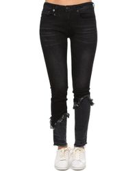 Shredded holes throughout bring a personalized authenticity to these ankle length skinny jeans. Faded denim with a light stretch lends a worn and broken-in edge. Color: Shiloh Shredded. 98% Cotton 2% EA. Model is 5'9" wearing size 27.