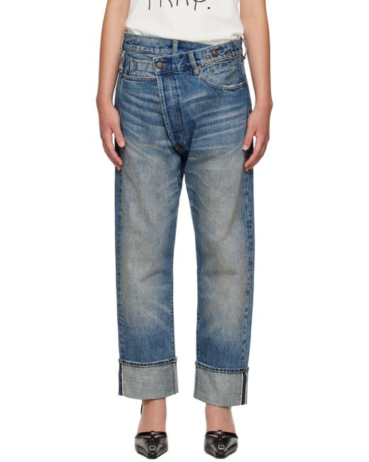Non-stretch selvedge denim jeans. · Fading, whiskering, and distressing throughout · Straight-leg · Belt loops and button fastening at modified waistband · Five-pocket styling · Offset open fly · Rolled cropped cuffs · Horse leather logo patch at back waistband · Antiqued bronze-tone hardware · Contrast stitching in tan Supplier color: Estin selvedge blue Colour: blue
