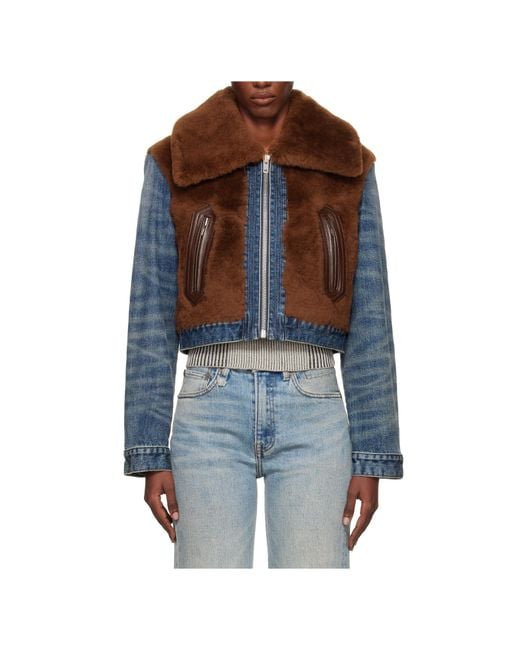 13oz stretch denim and lambskin jacket featuring fading, a button-fastened throat guard at the base of the collar, a zip closure at the front, zippered pockets at the waist, buttoned barrel cuffs, adjustable button tabs at the back hem, internal welt pockets, fleece lining, and satin lining at the sleeves. Colour: blue
