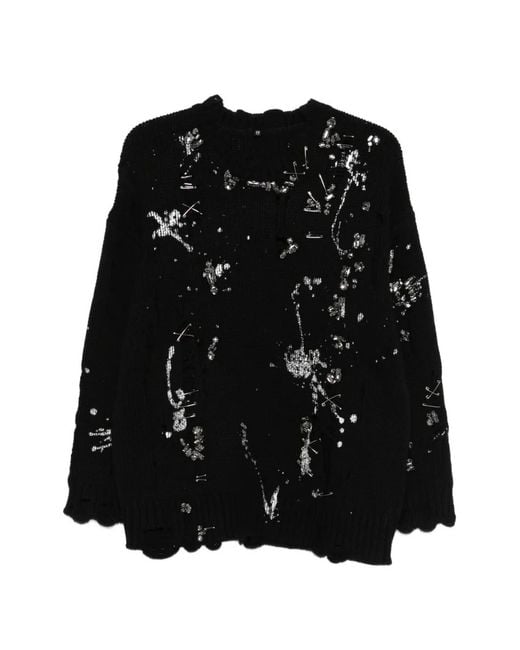Black merino wool crystal embellishments pin embellishments distressed effect scalloped hem round neck Size: XS. Gender: Female. Material:Merino. Colour: black