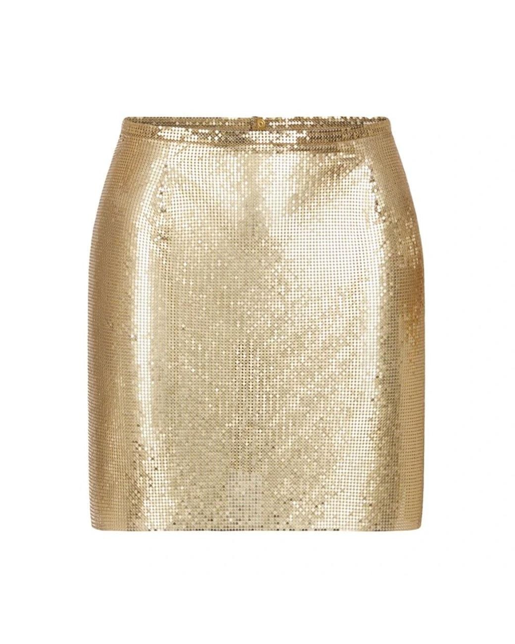Elevate your wardrobe with this stunning Chainmail Skirt featuring a gold-tone rear press-stud fastening. Designed by Rabanne, this short skirt combines modern elegance with a unique chainmail detail, perfect for making a bold fashion statement. Key attributes: Gold | Yellow | Chainmail | Gold-tone rear press-stud fastening | Chainmail detailing | Colour: natural