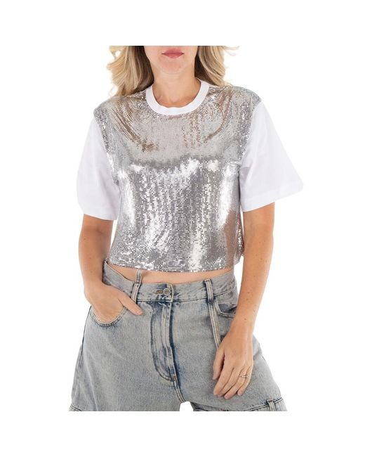 Rabanne Ladies Tops. Fashion category: T-Shirts & Henleys. SKU: 23AXTO639CO0481. Color: Silver / White. Rabanne Ladies Silver / White Metallic Mesh T-Shirt. Crafted from cotton, this top features an aluminum mesh design, chain-link detailing, a crew neck, short sleeves, and a cropped fit. Aluminium 100%, Cotton 100% Colour: grey