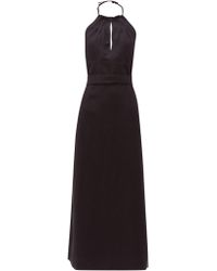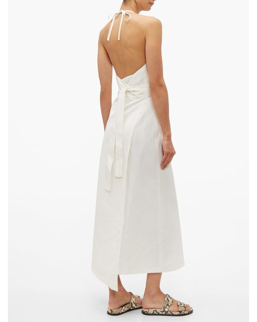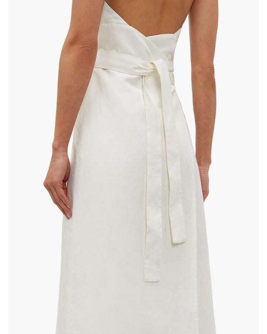 Raey's ivory slubby silk-blend wrap dress offers a column silhouette that's effortlessly minimal, tying into a pleated halterneck while the waist is cinched with a simple belt. It's made in the UK and sits just above the ankle – the epitome of clean-cut elegance. Pair it with printed slides for a subtle hint of colour. 62%SILK/38%LINEN. Colour: white