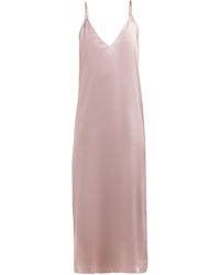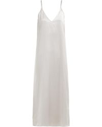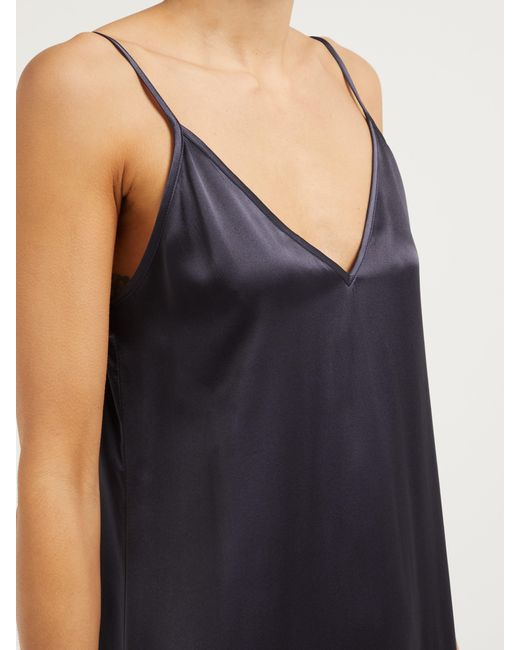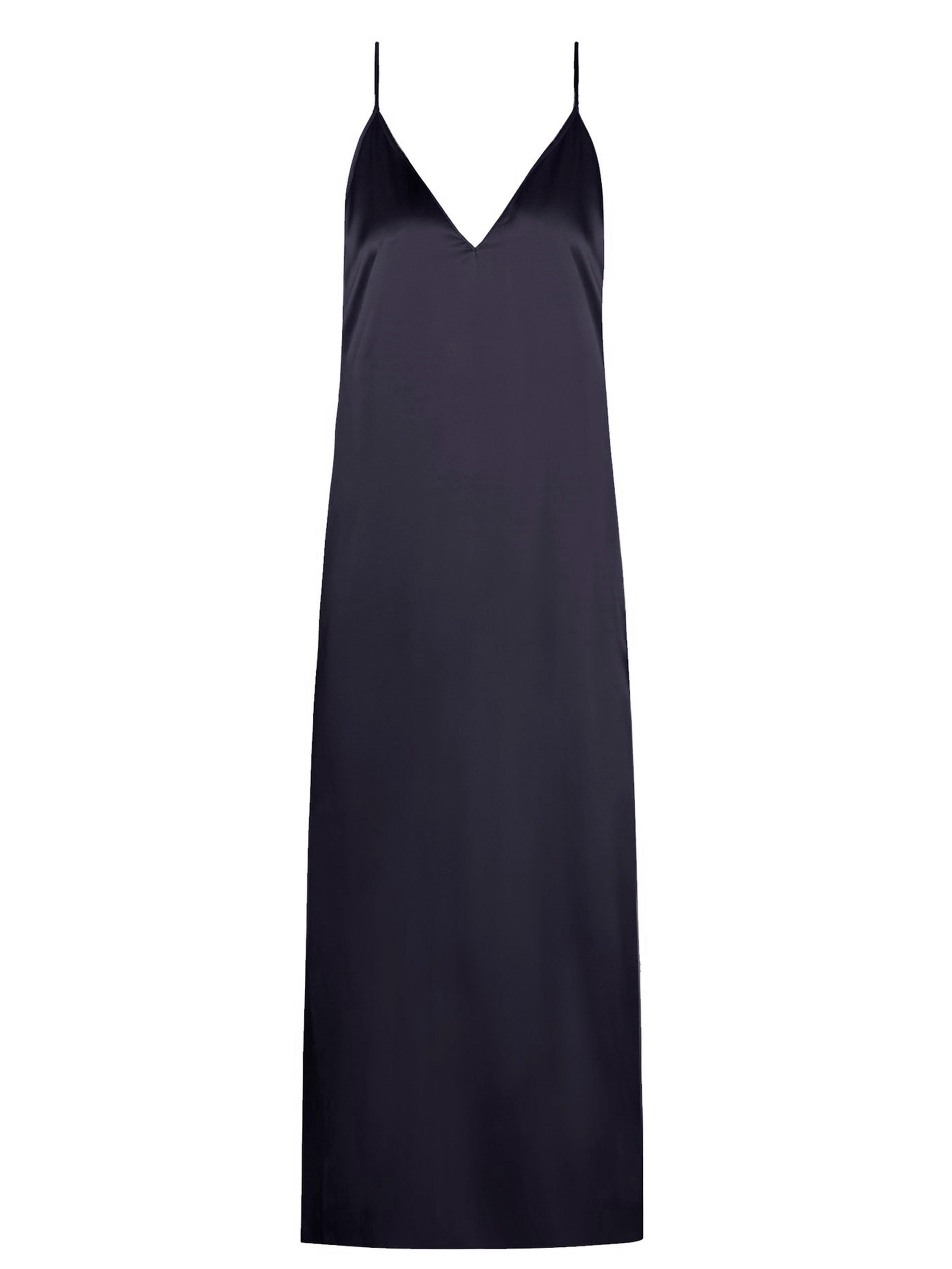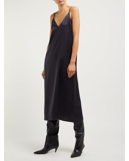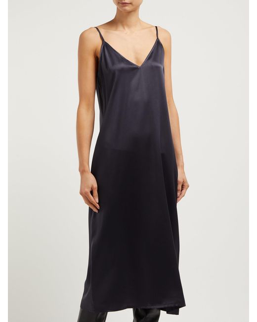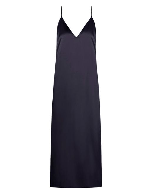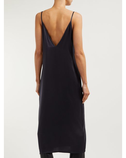 Raey's navy silk slip dress draws influence from 1990s minimalism and imbues it with signature nonchalance. Crafted in the UK, it's anchored by thin shoulder straps that lead to a V-neckline and falls to a midi hem. Style it with slouchy boots for a directional take. 100% silk. Colour: blue