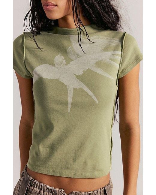 A stunning bird graphic transforms this basic baby tee from Ragabond from staple to statement. **Fit:** Fitted, semi-cropped **Features:** Comfy cotton micro-rib, boat neckline, subtle mock, capped sleeves, exposed seams, front graphic **Why We ❤ It:** Pair with low-rise jeans and a statement belt for the perfect complement. Birds In Flight Tee by Ragabond at Free People in Oil Green, Size: Small Colour: green