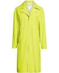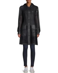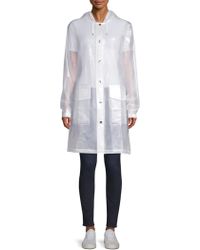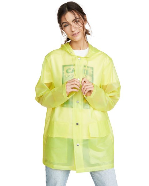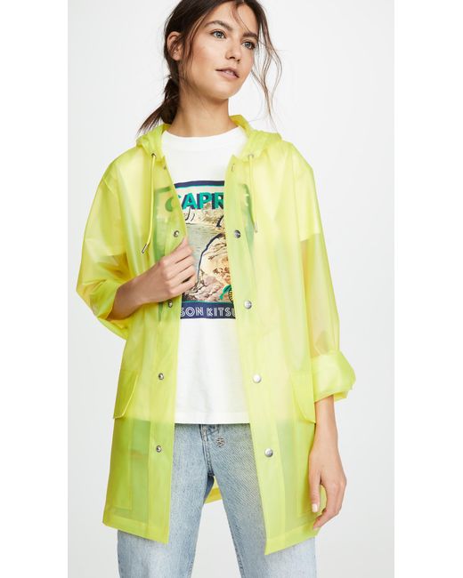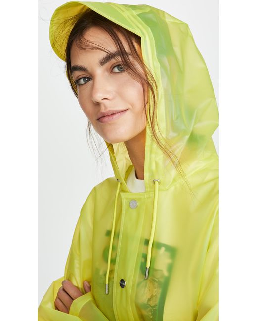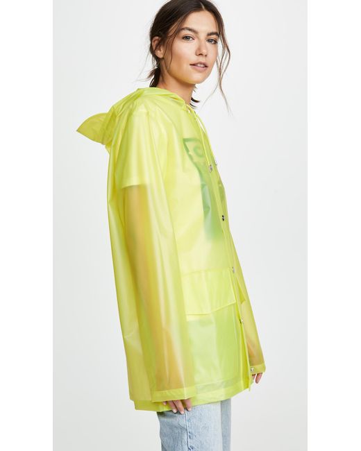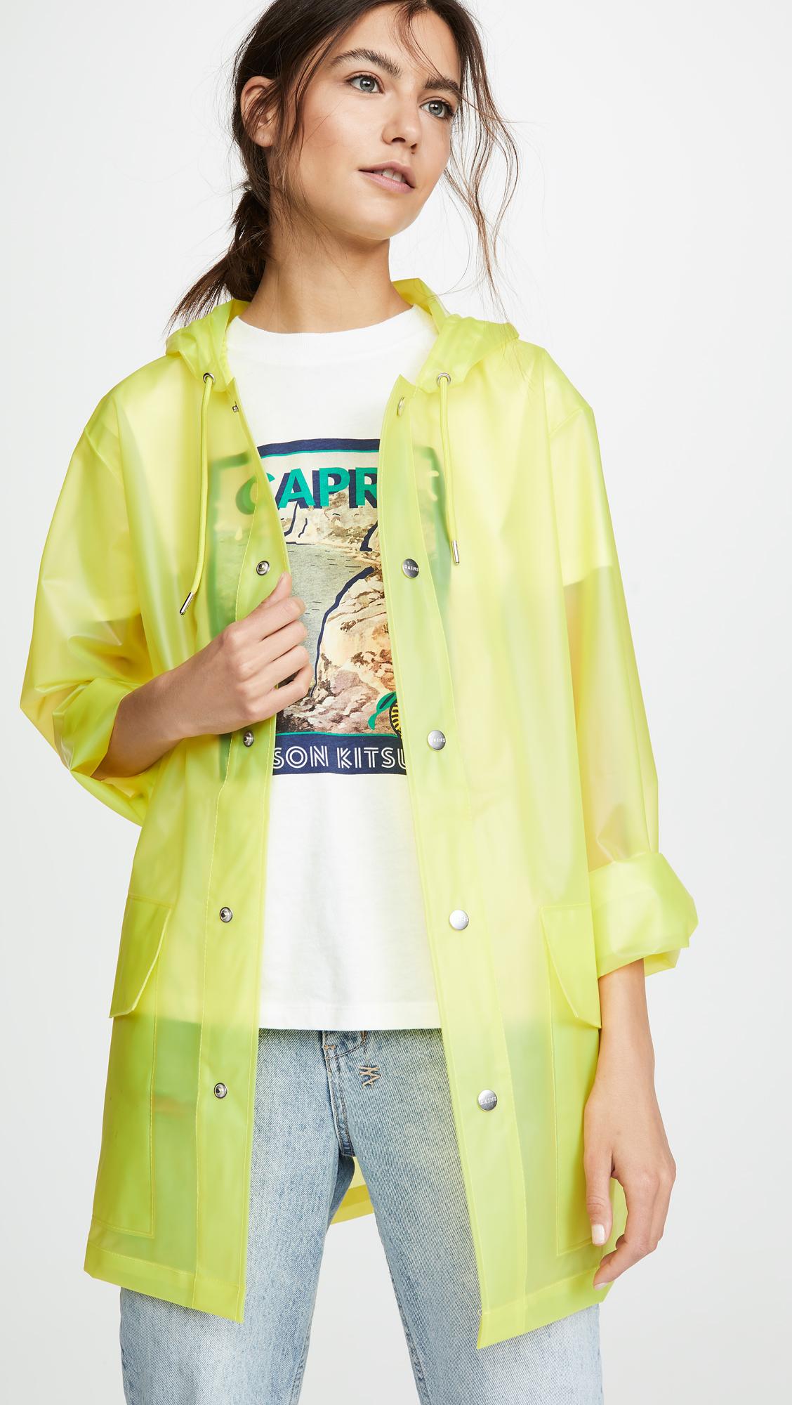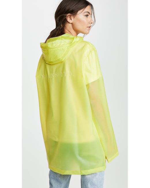 Fabric: Vinyl. Transparent. Waterproof. Snap at cuffs. Drawstring hood with visor. Long profile. Long sleeves. Button at front. Flap front pockets. Shell: 100% polyurethane. Unlined. Wash warm. Style #RAINS30024. Length: 30.25in / 77cm, from shoulder. Colour: yellow