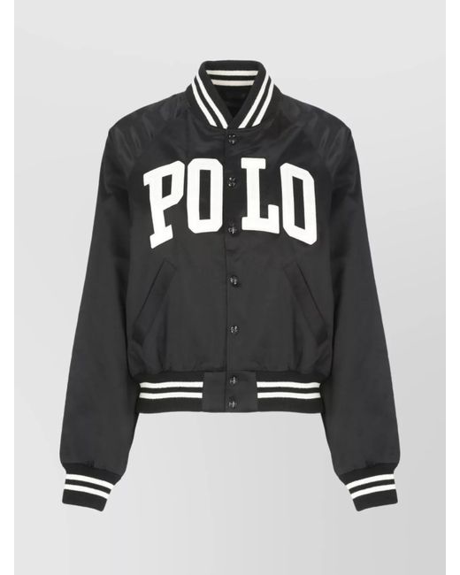 Women's Black Bomber Jacket With V Neckline And Ribbed Trims