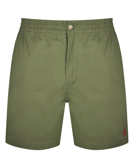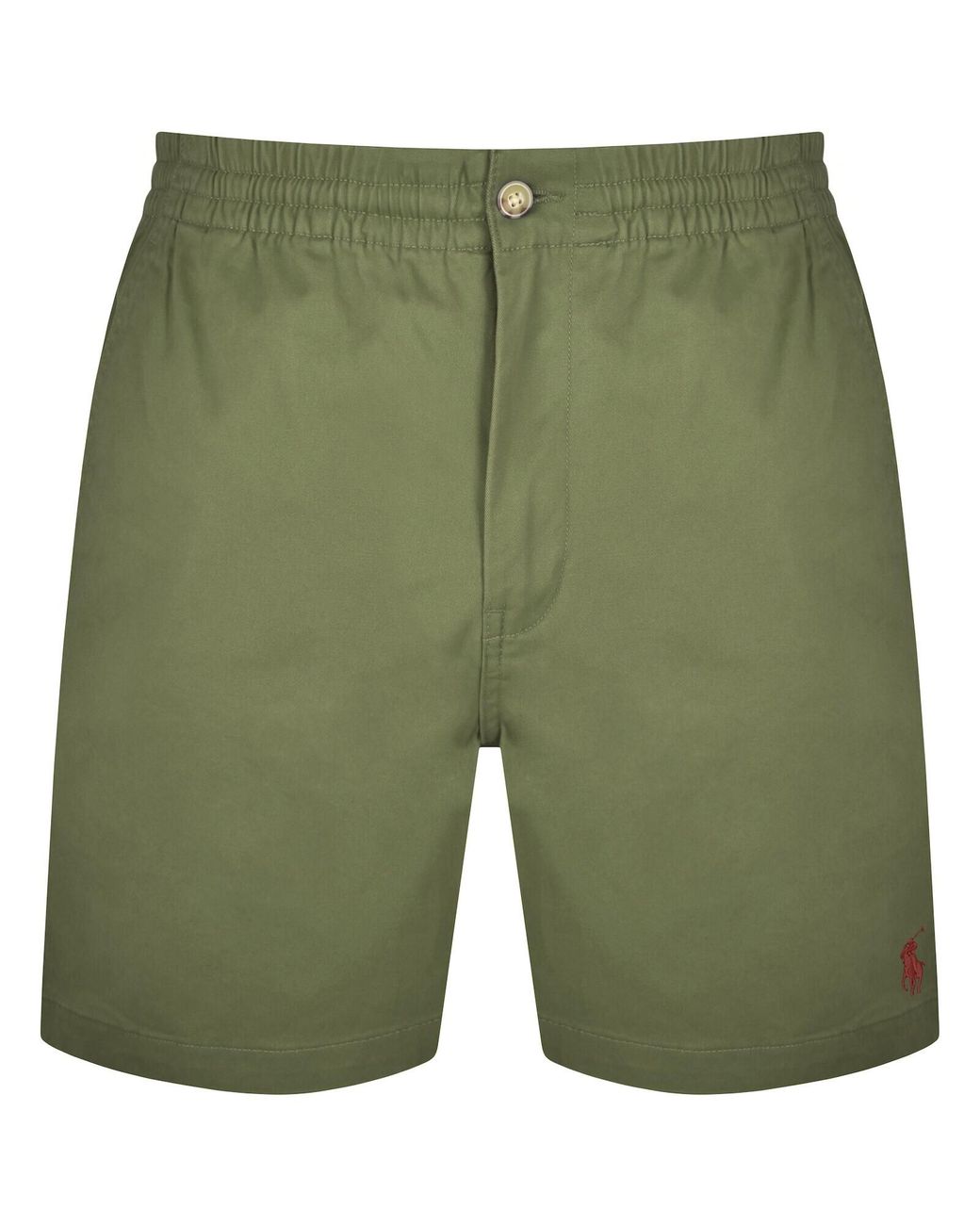 Ralph Lauren Prepster Shorts In Mountain Green Classic Fit. An elasticated waistband with an additional white drawstring on the interior and a zip fly with a top button fastening. Two pockets on the hips with two button fastening pockets on the reverse and the signature embroidered Ralph Lauren Polo Player logo is situated on the left leg in red. 97% Cotton And 3% Elastane. Colour: green