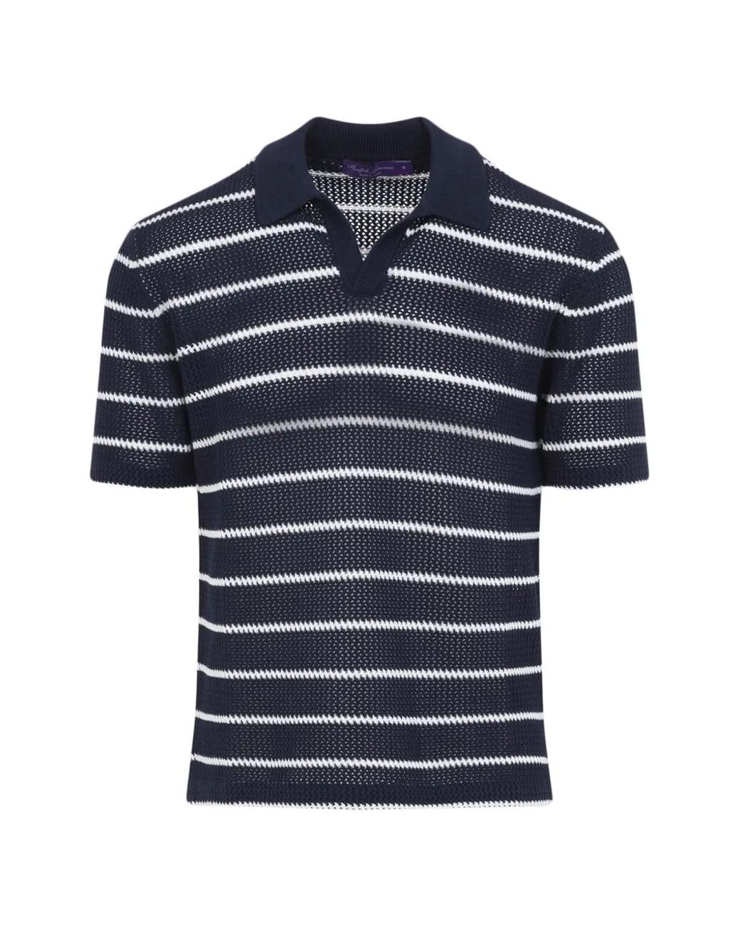 Short Sleeve Knit Striped Polo Shirt - Blue