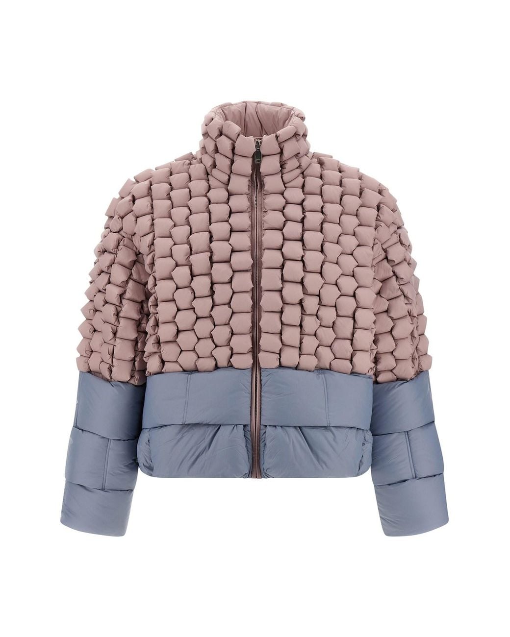 Two-tone braided nylon down jacket with 3D structure with goose feather padding, standing collar, front zip closure, pockets, long sleeves with dropped shoulders. Composition: 100% nylon. Size&Fit: oversized fit. Colour: red