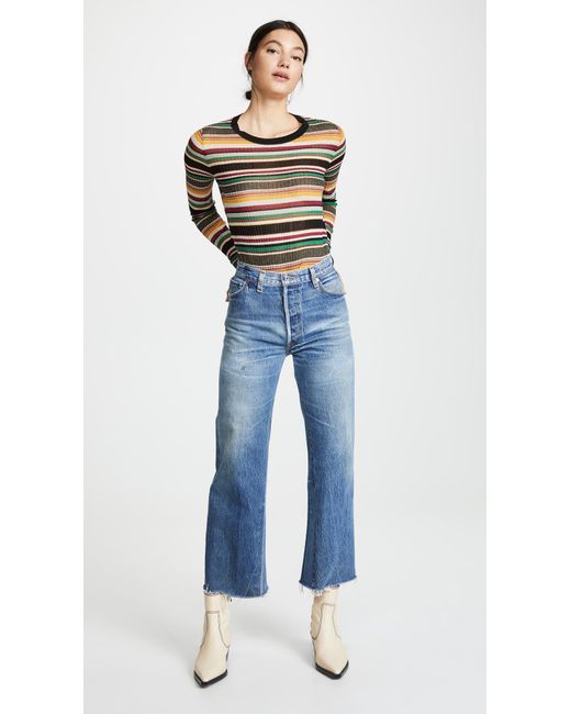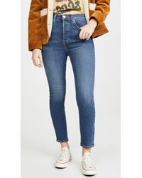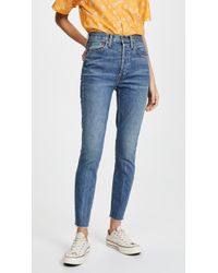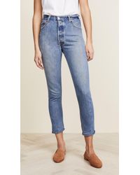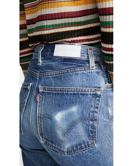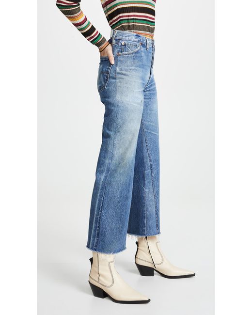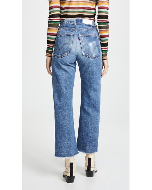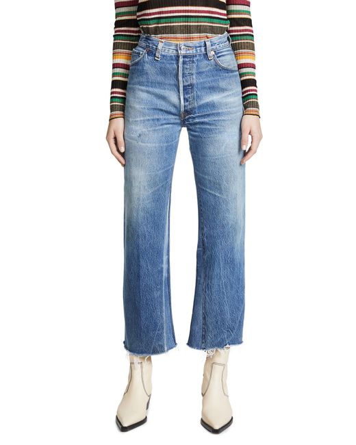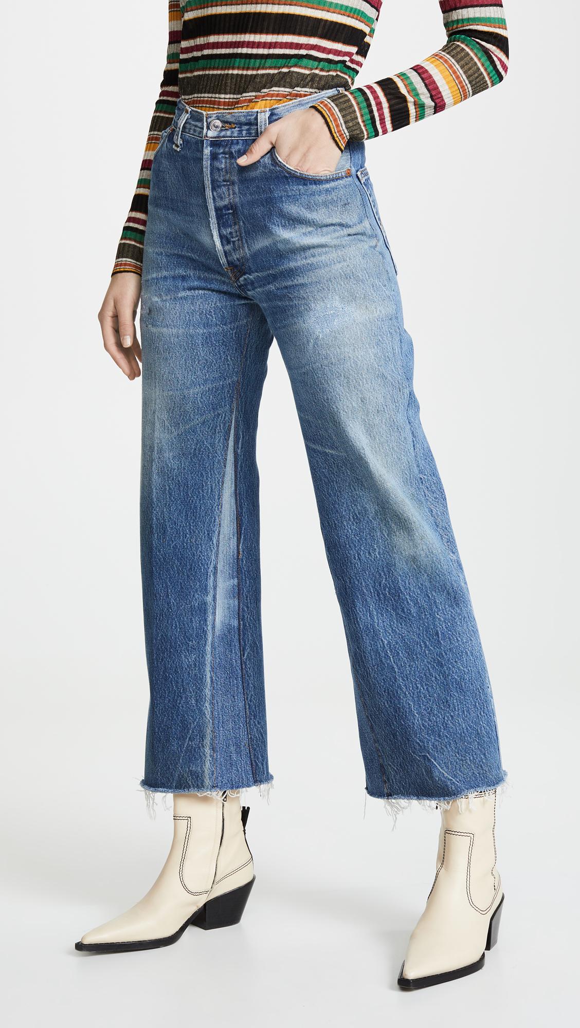Fabric: Non-stretch denim. Interior inset panels. High-waist and raw hem. Distressed. Wide-leg cut. Ankle length. Hidden button at fly. Slant front pockets and patch back pockets. Shell: 100% cotton. Wash cold. Reconstructed from previously owned Levi's jeans, these are one-of-a-kind. Wash colour may vary. Style #REDON30219. Rise: 11.5in / 29cm. Inseam: 27.5in / 70cm. Leg opening: 19.75in / 50cm. These authentically faded RE/DONE jeans have 'new favorite' written all over them! They're designed with a comfy high rise, and a cropped, wide-leg silhouette that's sure to sweep you off your feet. Colour: blue