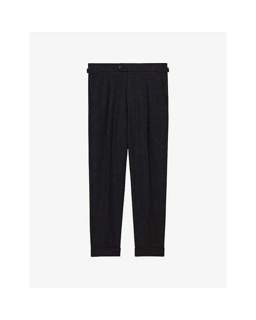 Reiss wool-blend trousers52% wool, 35% viscose, 13% polyesterButton and zip-fly fasteningSlim fit, side adjusters, two pockets at the side, straight legDry cleanModel is 6ft 2in/1.88m and wears a size UK 32Midweight, non-stretch Colour: black