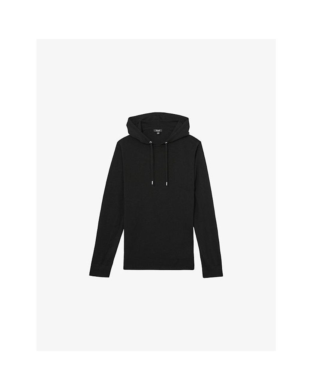 Reiss wool knitted hoodyPulls onRegular fit, drawstring hood, long sleeves, fine knit texture, branded silver-toned hardware, ribbed trimsHand wash coldModel is 6ft 3in/1.91m and wears a size mediumLightweight, stretchy Colour: black