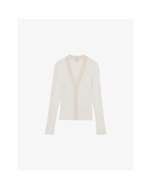 Reiss knitted top62% viscose, 38% nylonSlim fit, V-neck, long sleeves, two-tone craft stitch at front, all-over ribbed and knittedHand washTrue to sizeMidweight, slight stretch Colour: white