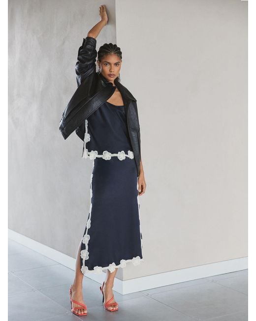 Women's White Satin Floral-Lace Trim Midi Skirt