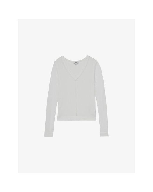 Reiss woven top62% viscose, 38% nylonRegular fit, V-neck, long sleeves, sheer sleeves and trimHand washTrue to sizeModel is 5ft 10in/1.78m and wears a size UK 8Lightweight, non-stretch Colour: white