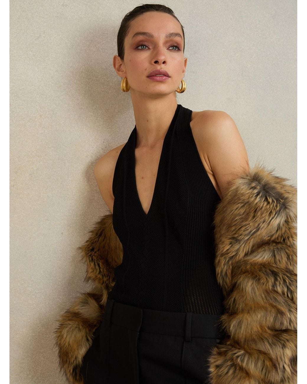 Women's Black Atelier Stitch-Detail Halter Bodysuit