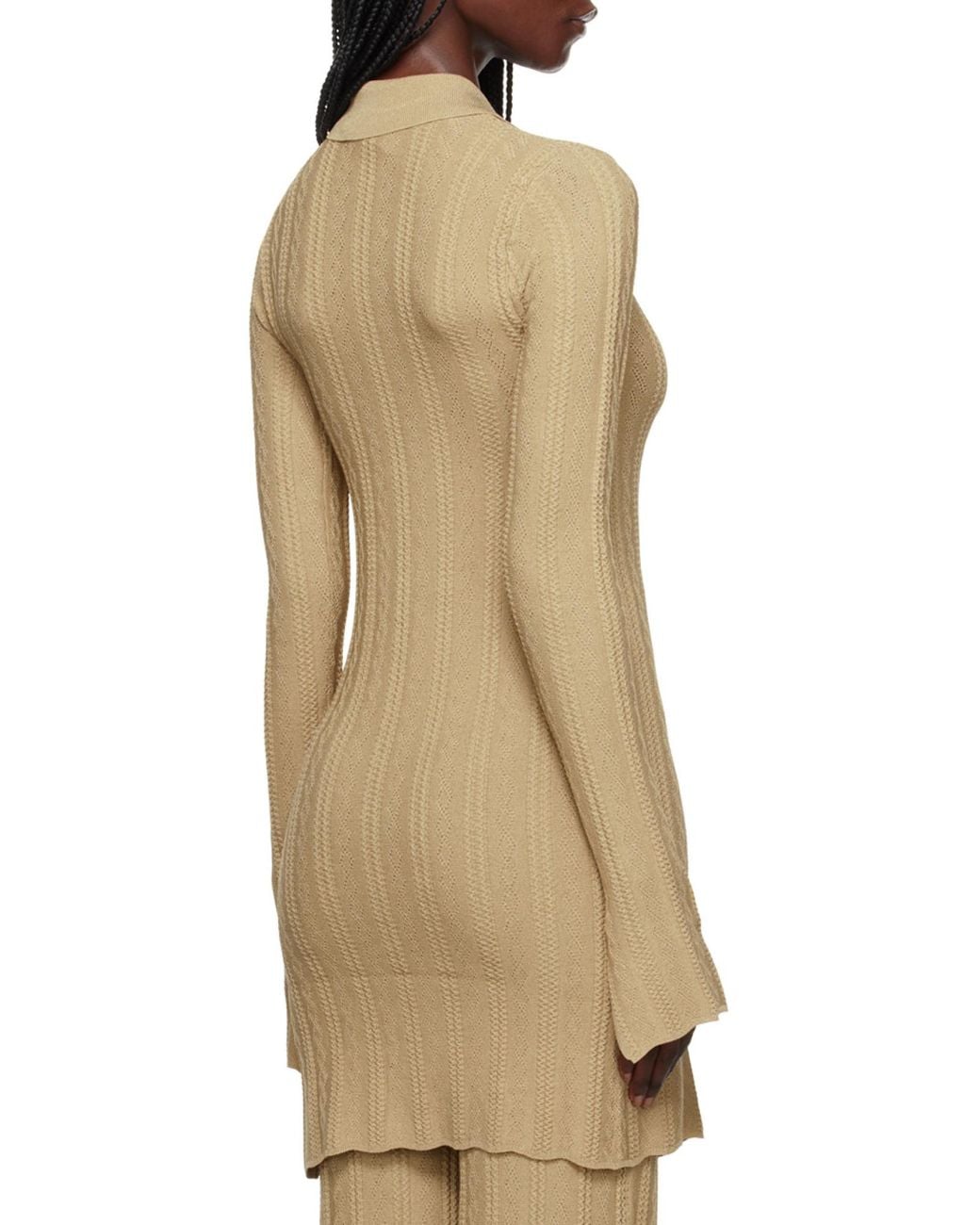 Lapel, buttons open and close, long sleeves, and split cuffs. Colour: natural