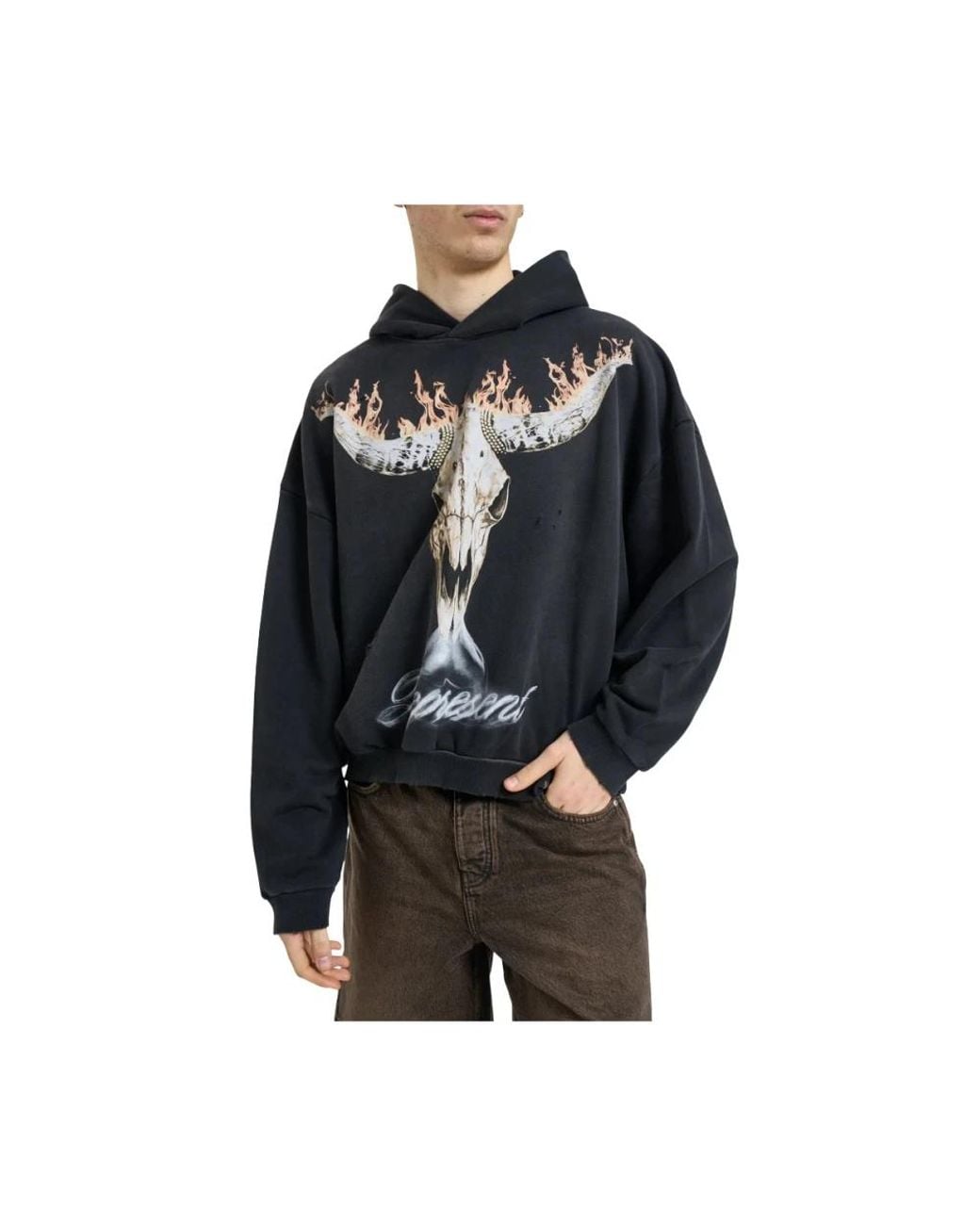 Represent Sweatshirt — a hooded sweatshirt featuring a black graphic print and distressed detailing, designed for relaxed everyday wear. Key attributes: Black | Hooded | Graphic print | Distressed effect | Ribbed hem | Dimensions & fit: Relaxed fit Colour: black