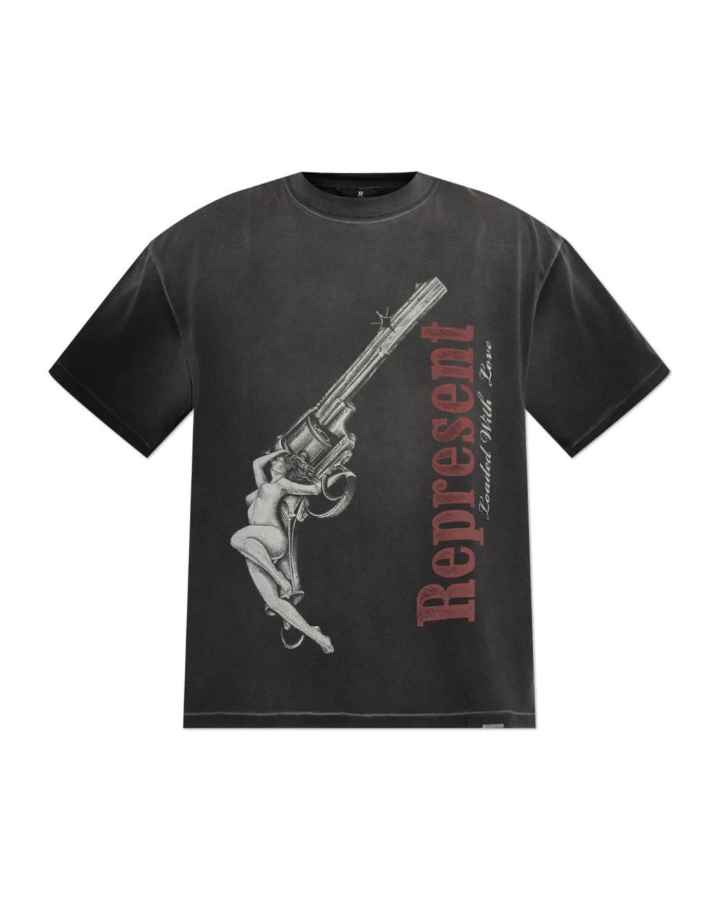 Represent Loaded With Love T-Shirt pairs a bold printed graphic with a washed, vintage finish and a signature metal logo plaque. Designed for a relaxed, oversized look, it balances statement detailing with substantial cotton construction. Key attributes: Stained Black | Cotton | Breathable fabric | Heavyweight 220Gsm | Machine washable | Durable heavyweight fabric | Printed graphic (woman with pistol) | Vertical side inscription | Bold red "Represent" signature | Metal logo plaque at hem | Washed vintage finish with subtle discoloration | Ribbed crew neck | Short sleeves | Dimensions & fit: Model height: 185cm | Model chest: 92cm | Model waist: 74cm | Model hips: 91cm | Model is wearing size: L | Oversized fit | Loose, slightly oversized silhouette with ribbed crew neck and short sleeves | Composition & care: 100% Cotton, 220Gsm | Wash with similar colours. Remove promptly from machine. Do not dry in direct sunlight. Do not tumble dry. Do not rub isolated stains. Colour: black