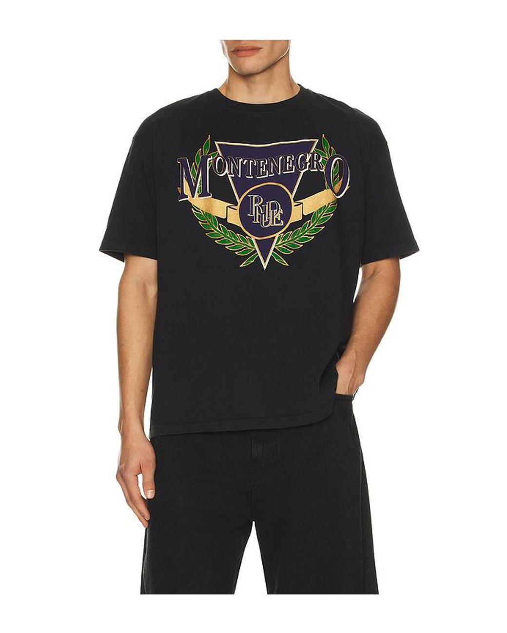 Rhude Montenegro Regatta Tee in Black. Size L. Also in M, S, XL/1X, XXL/2X. Rhude Montenegro Regatta Tee in Black. Size M, S, XL/1X, XXL/2X. 100% cotton. Made in USA of imported fabric. Machine wash. Front graphic. Midweight jersey fabric. RHUF-MS243. RHPS26TT11012.