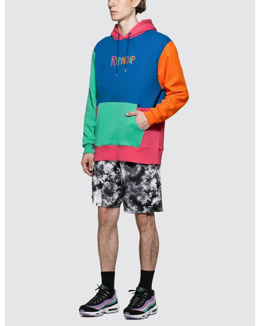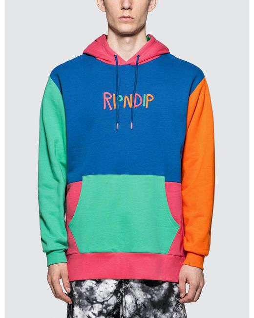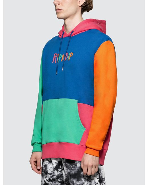 RIPNDIP- Colour Block Multi Panel Hoodie- Ribbed cuffs and hem- Colorblock design- Embroidered brand logo on front- Kangaroo pocket- Regular fit- Color: Multicolor- 100% Cotton. Colour: blue