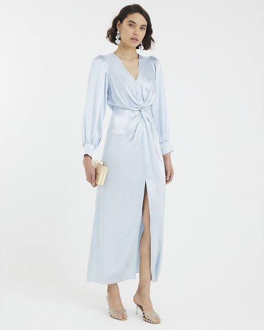 Women's Blue Maxi Dress Satin Long Sleeve Twist Front Viscose