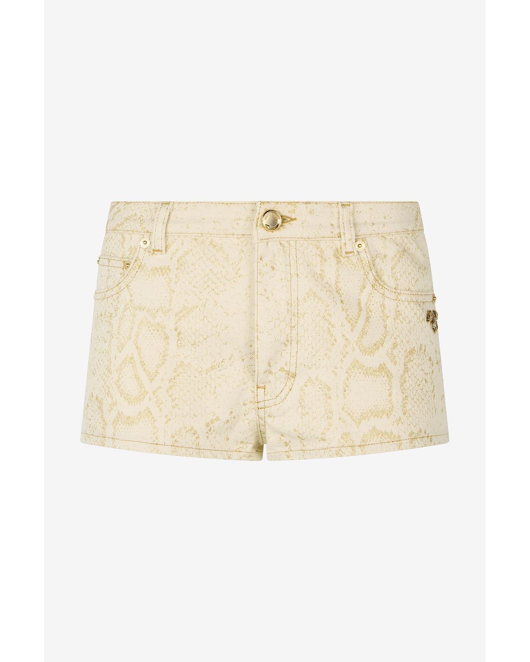Micro shorts in stretch cotton Metallic python pattern Engraved metal snake detail Five pocket design Button and zip fastening Branded leather patch at the back Colour: natural