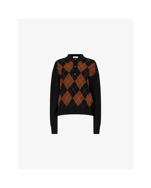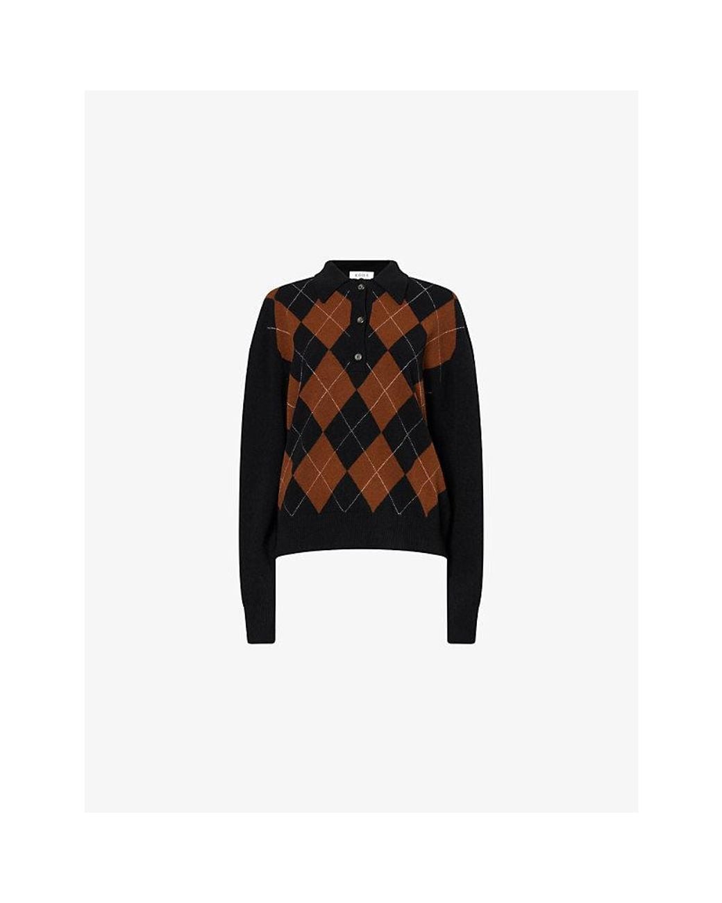 Women's Black Argyle-Check Knitted Wool Polo Top