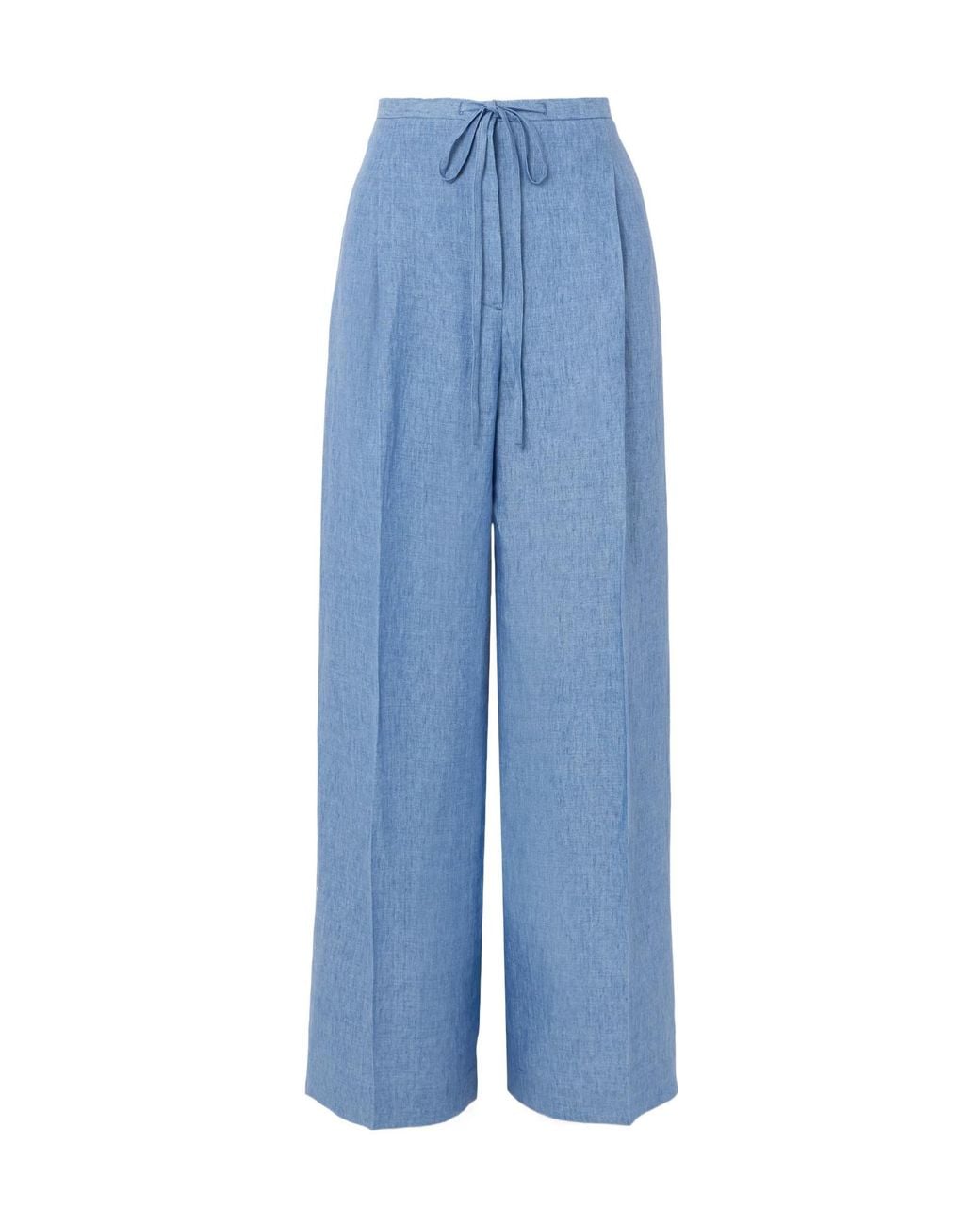 Made from lightweight linen fabric, these trousers feature a drawstring waistband and a wide-leg design. Colour: blue