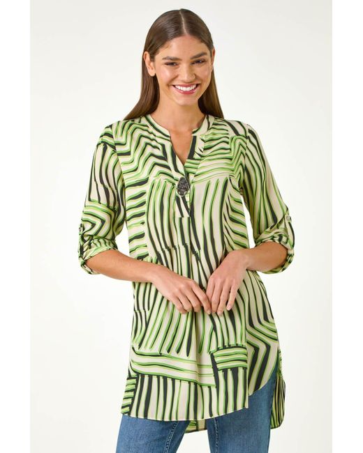 Women's Green Abstract Linear Print V-Neck Button Top