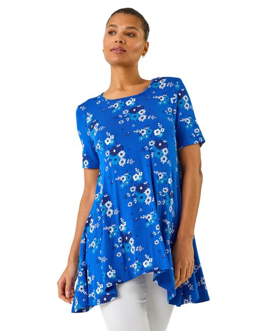 Floral Print Hanky Hem Tunic Top from Roman. Embrace a taste of summer with this feminine floral print tunic top. Featuring an all-over floral ditsy print with a classic round neckline and short sleeves, this top is a must-have for the Spring Summer season. Finishing with a hanky hem and tunic style, the comfortable stretch jersey fabric ensures a flattering fit all day long. Pair with linen trousers and sandals for a sophisticated look perfect for warm weather days ahead! Colour: blue