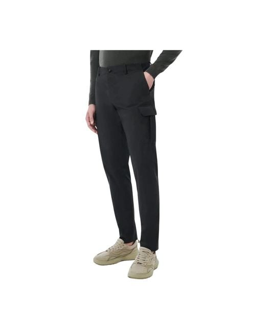 These RRD slim-fit trousers for men are designed for comfort in warm weather. The cargo style trousers are navy blue with a super matte and lightweight material, featuring a softly worn texture. They have a regular waist and a comfortable fit, made with exclusive wrinkle-resistant and easy-care Surflex® stretch fabric. The horn buttons close the waistband, concealed by a front flap. Innovative side pockets, back pockets with a black micro-injected logo on the right, and a distinctive cargo pocket on the leg add dynamism to the vintage-inspired design. Colour: black
