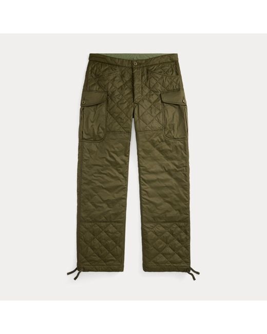 Olive-hued cargo trousers. Lightweight diamond-quilted construction. Interior drawstring waist and hems. Button fly. Reinforced knees and seat. Colour: green