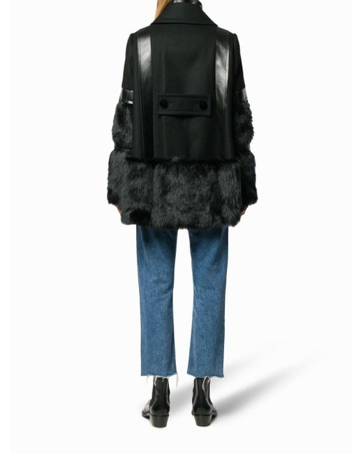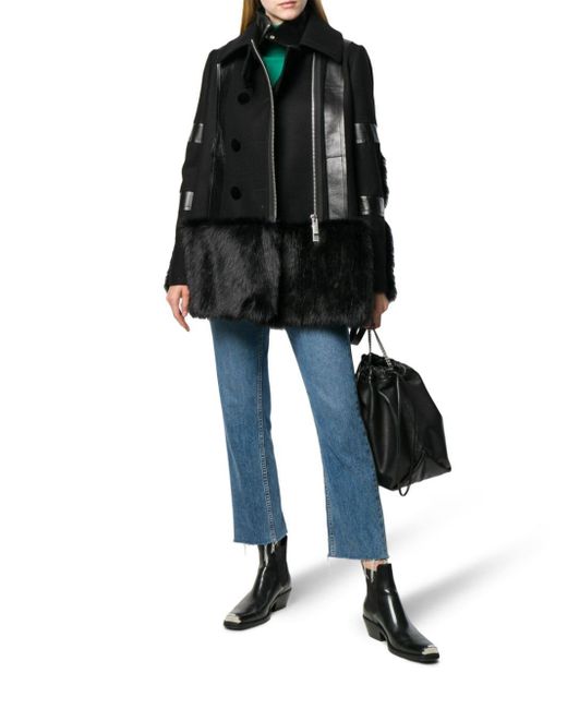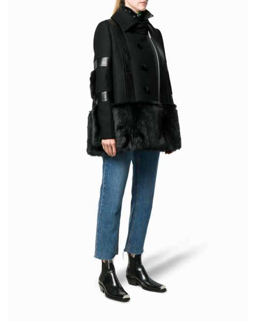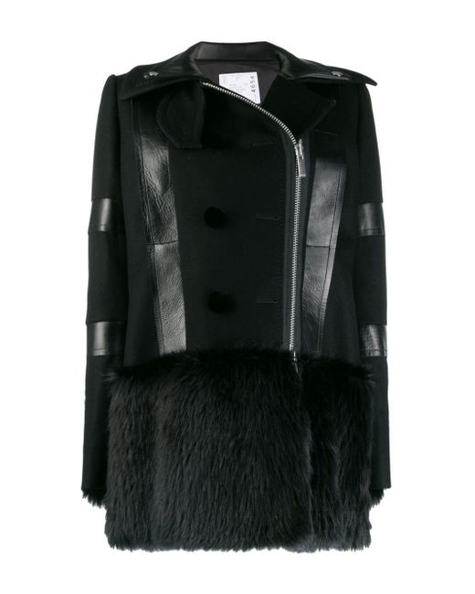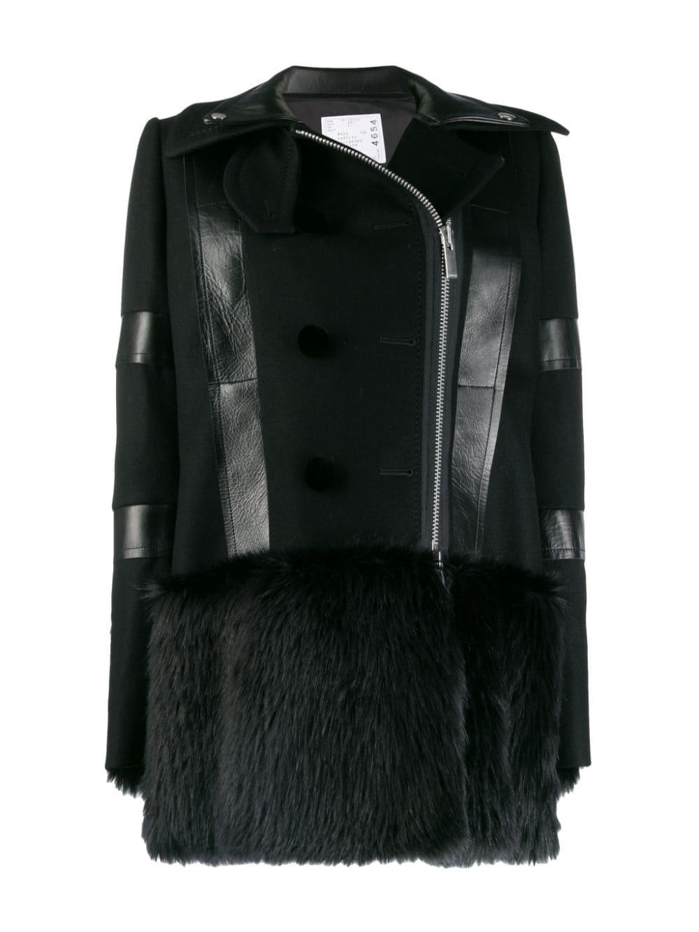 Sacai continues to challenge conventional garment construction by creating ready to wear hybrid items that cater to lovers of the brands sleek Japanese aesthetic, as showcased by this black wool faux fur-trimmed coat. Featuring a double pointed collar, an off-centre front zip fastening, long sleeves, a leather trim, decorative buttons and a belt detail to the rear. Colour: black