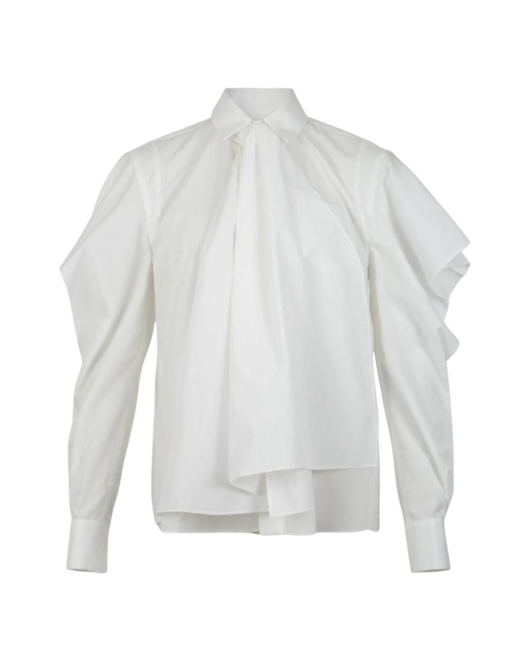 Sacai Camicia presents a fluid silhouette with a classic collar finished by a tied band and dramatic ruffled sleeves. It balances refined detailing and volume for elevated casual or dressy outfits. Key attributes: White | Off white | Classic collar with tied band | Voluminous ruffled sleeves | Fluid silhouette | Dimensions & fit: Fluid silhouette Colour: grey