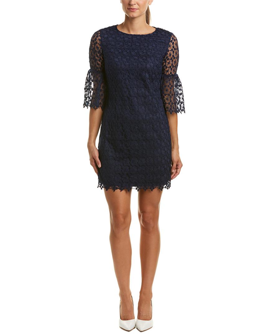 Go to Rue La LaColor/pattern: navy Approximately 35in from shoulder to hem Measurement was taken from a size 2 and may vary slightly by size Model is 5ft 10in Design details: lace design, sheer bell-sleeves Exposed zipper 100% polyester Machine wash Imported. Colour: blue
