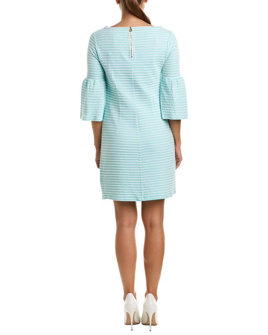 Go to Rue La LaColor/pattern: aqua Approximately 36in from shoulder to hem Measurement was taken from a size small and may vary slightly by size Model is 5ft 10in Design details: bell-sleeves Exposed zipper Shell: 59% cotton, 40% polyester, 1% spandex Combo: 100% polyester Machine wash Imported. Colour: green